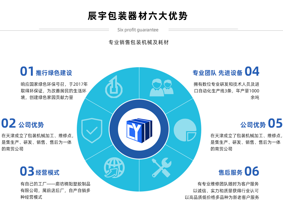 天津辰宇包裝器材有限公司原天津市辰宇商貿有限公司,位于天津市南開區(qū)密云一支路新南馬路五金城二區(qū)33棟106號,本公司主要經營:打包帶,打包機系列,封箱機系列,纏繞機系列,拉伸膜,膠帶,尼龍繩,其他包裝耗材等產品 公司產品質優(yōu)價廉,暢銷全國各大城市。同等質量比價格,同等價格比質量,我們確保質量,價錢合理,交貨迅速及時。公司始終秉承“精益求精,鑄造品質的典范”的經營理念,真誠為廣大客戶提供真誠的服務! 天津市辰宇包裝器材有限公司,感謝廣大新老客戶的鼎力支持,竭誠歡迎社會各界朋友前來洽談業(yè)務,愿真誠合作攜手共創(chuàng)美好未來!
